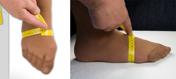 Całym ciężarem ciała stanąć na stopie i na wysokości środka łydki (w najgrubszym miejscu) zmierzyć jej obwód.