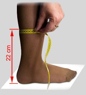 Całym ciężarem ciała stanąć na stopie i na wysokości 22 cm zmierzyć obwód pod łydką. Następnie proszę wybrać zakres z w/w tabelek dla odpowiedniej cholewki.